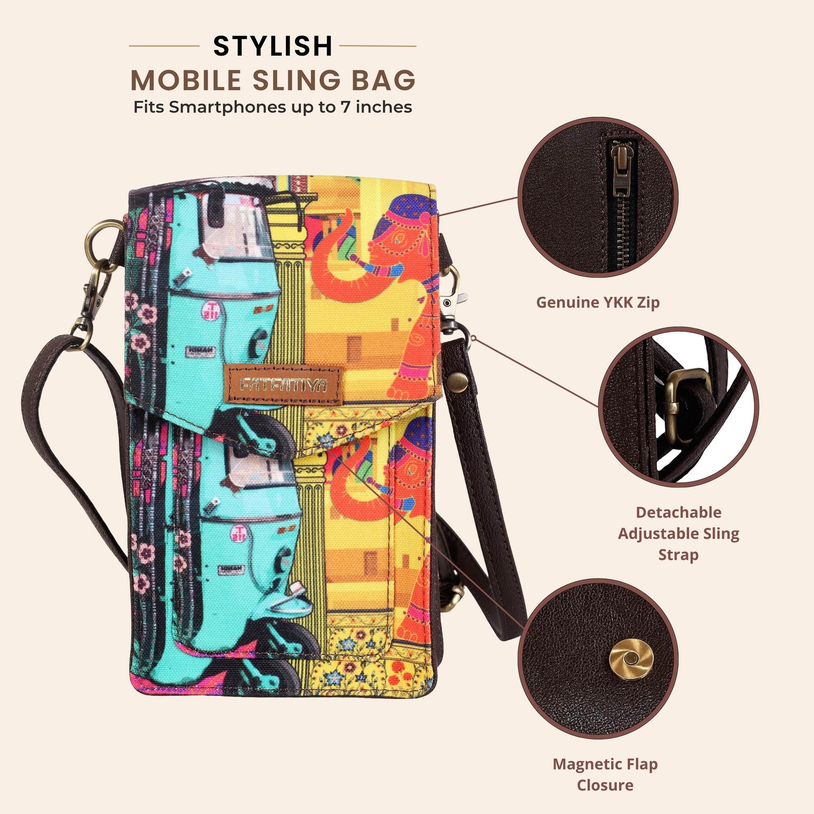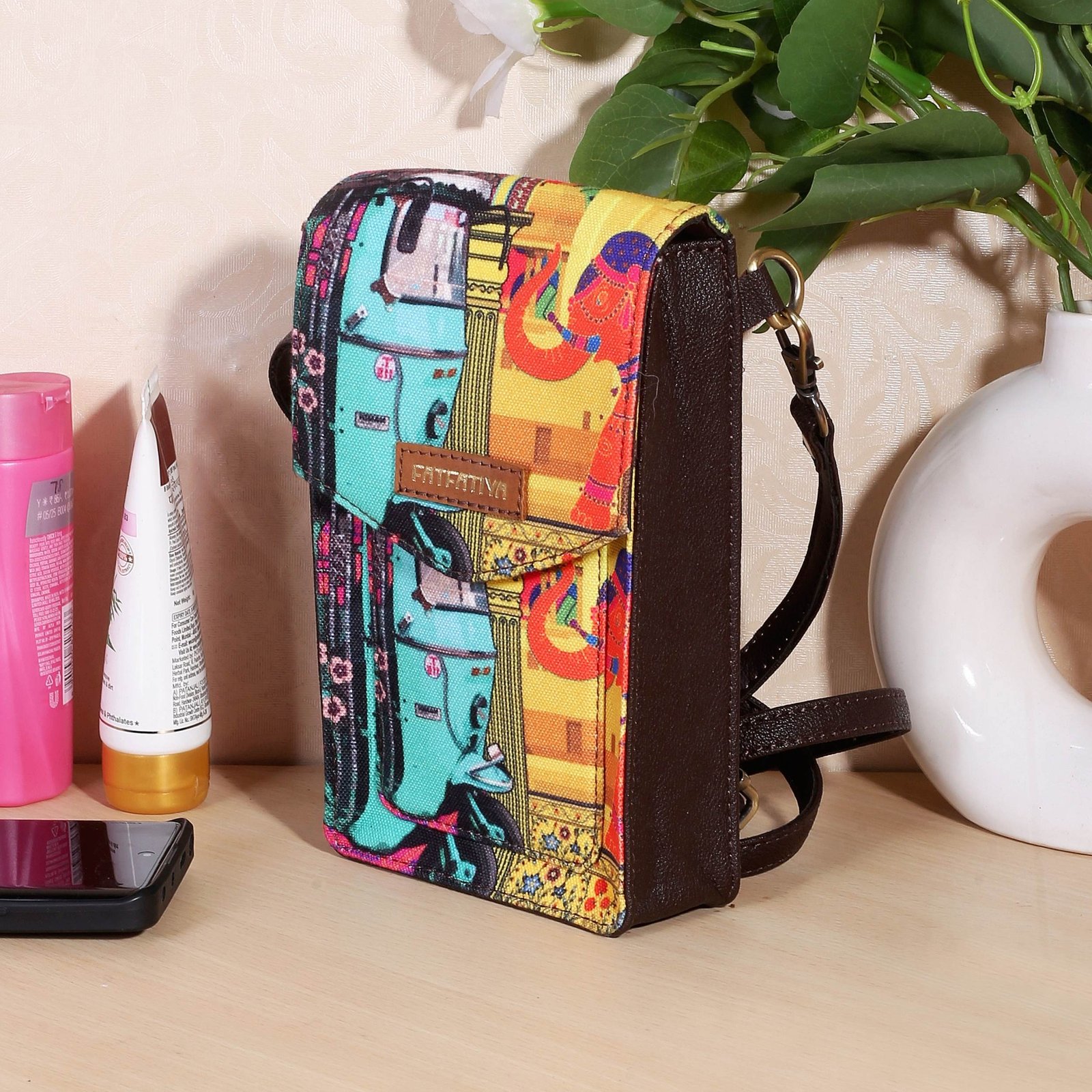Add a touch of vibrant street culture to your everyday style with this unique auto rickshaw print mobile sling bag from Fatfatiya.