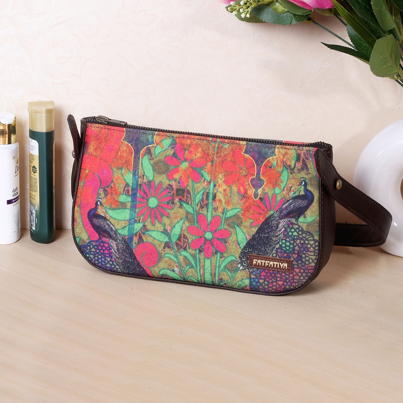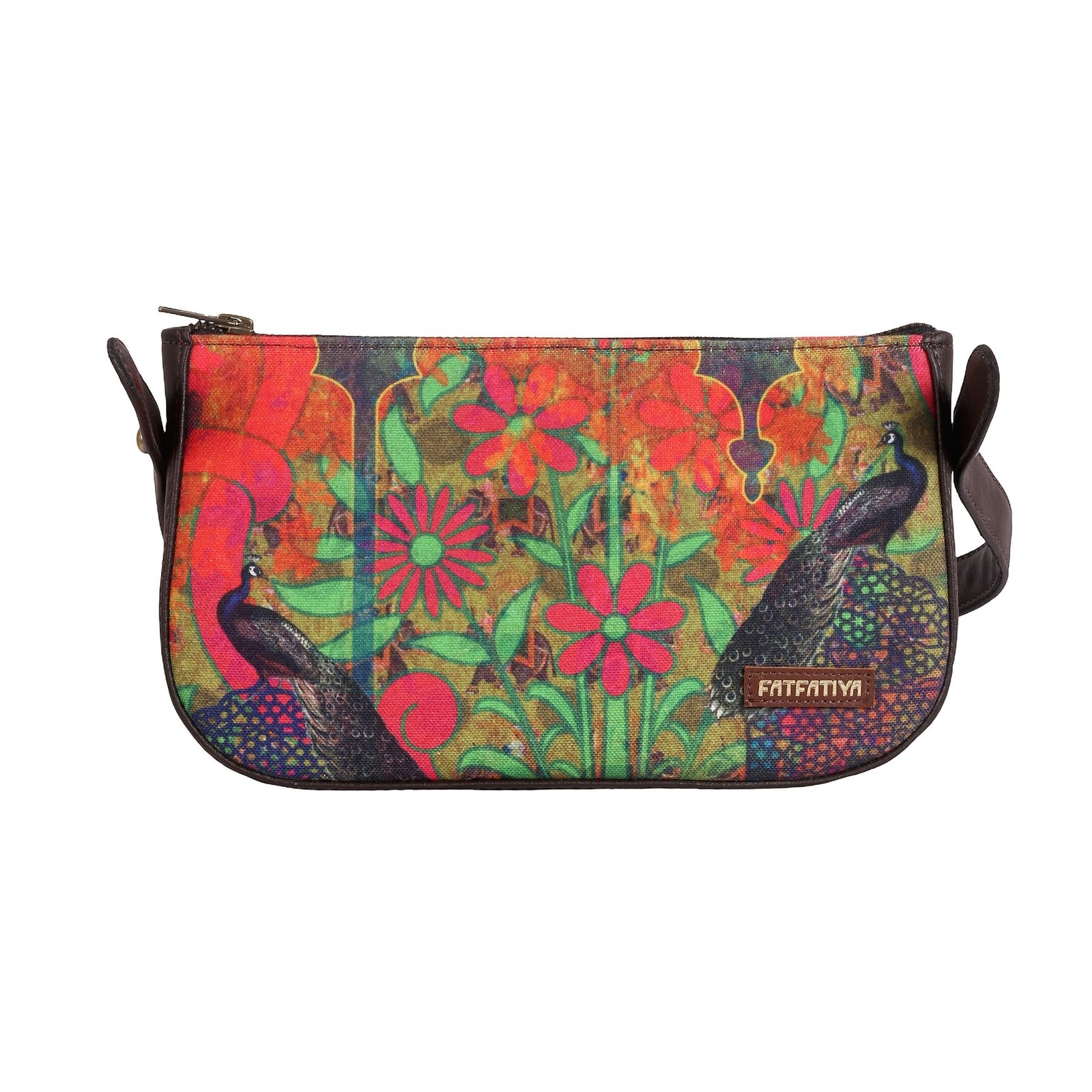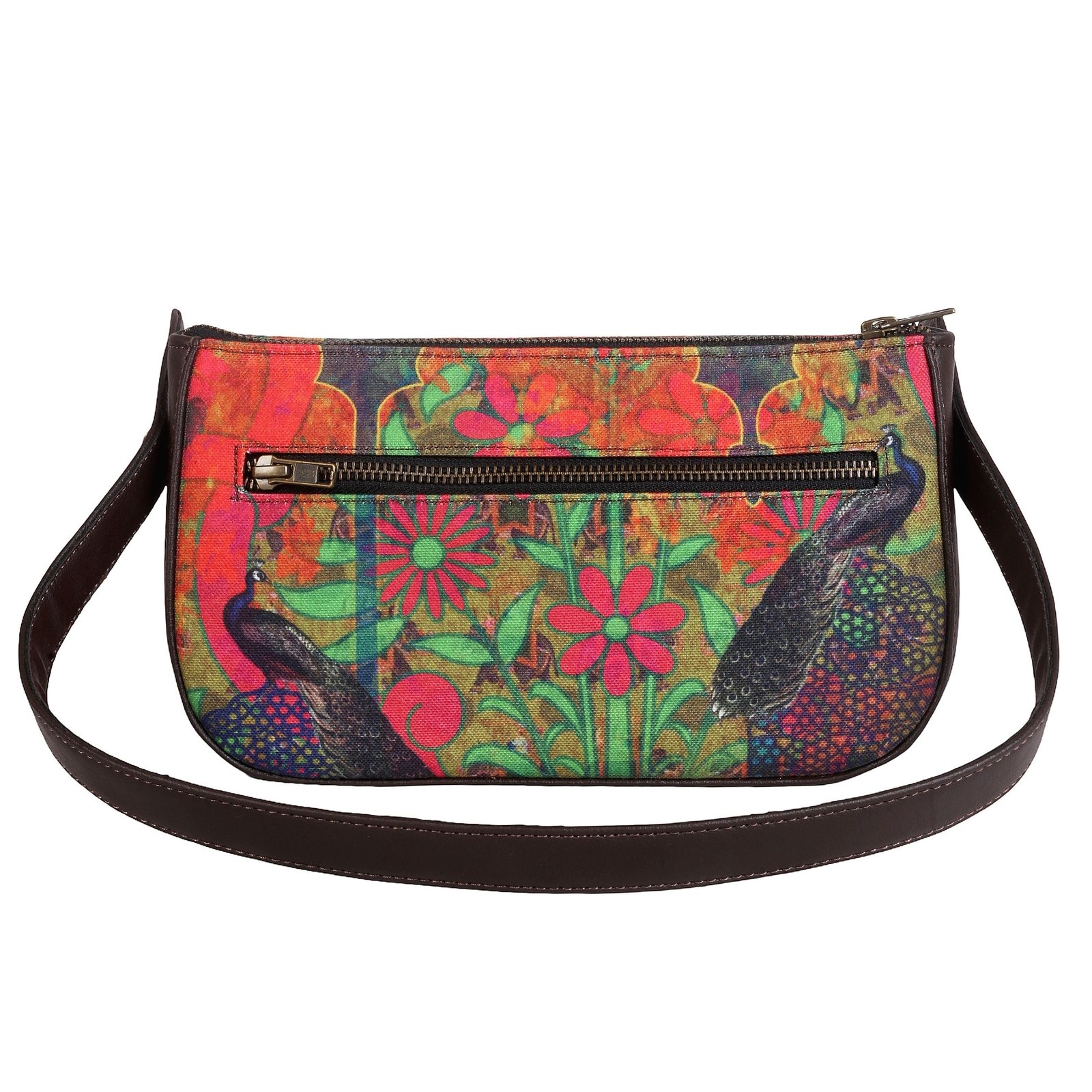 - Dual Peacock Print Shoulder Bag for Women – Features vibrant peacock artwork with bold floral folk design inspired by Indian heritage, making it a stylish ethnic handbag for women.