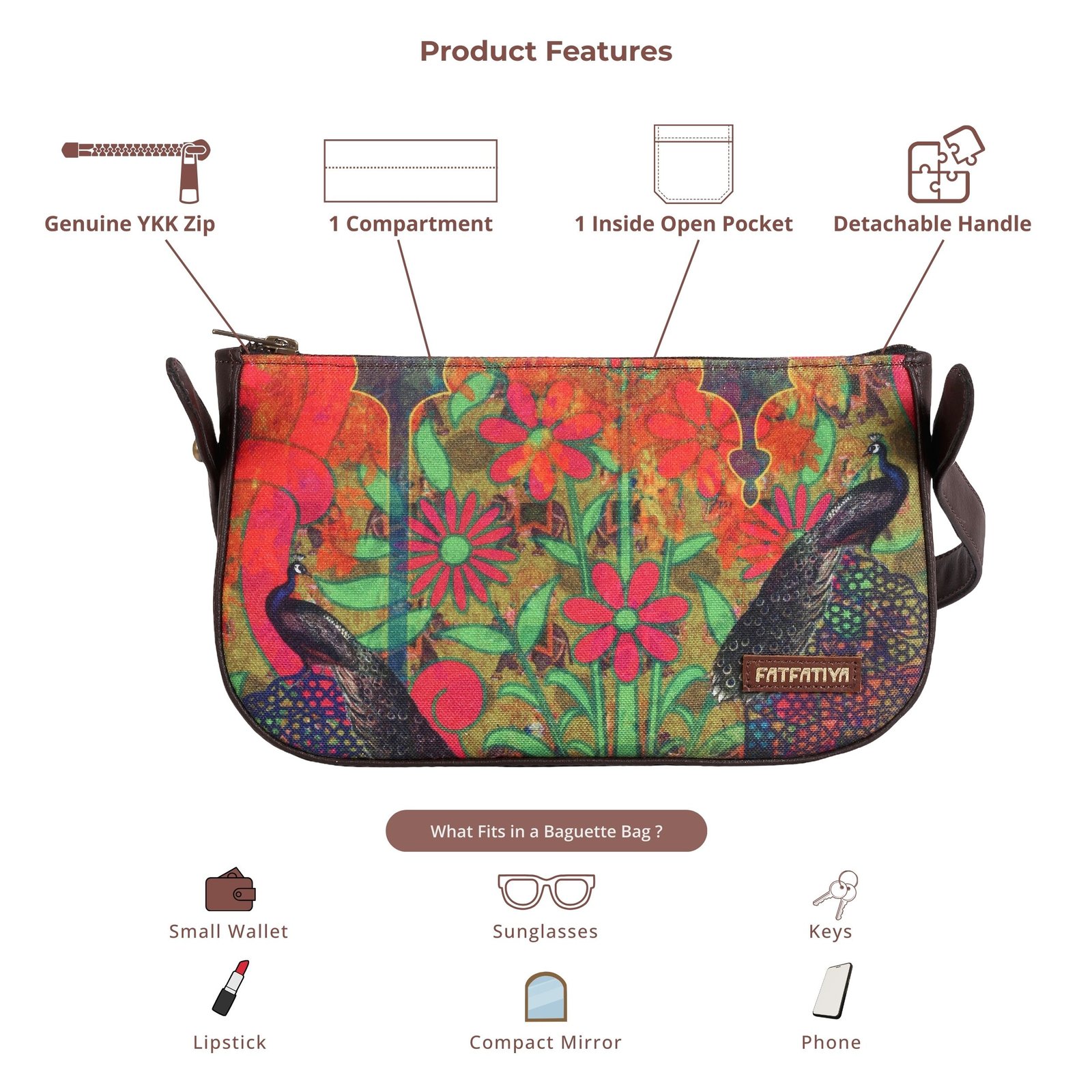 - Handcrafted in India – A unique peacock print baguette bag that blends traditional Indian art with modern fashion.