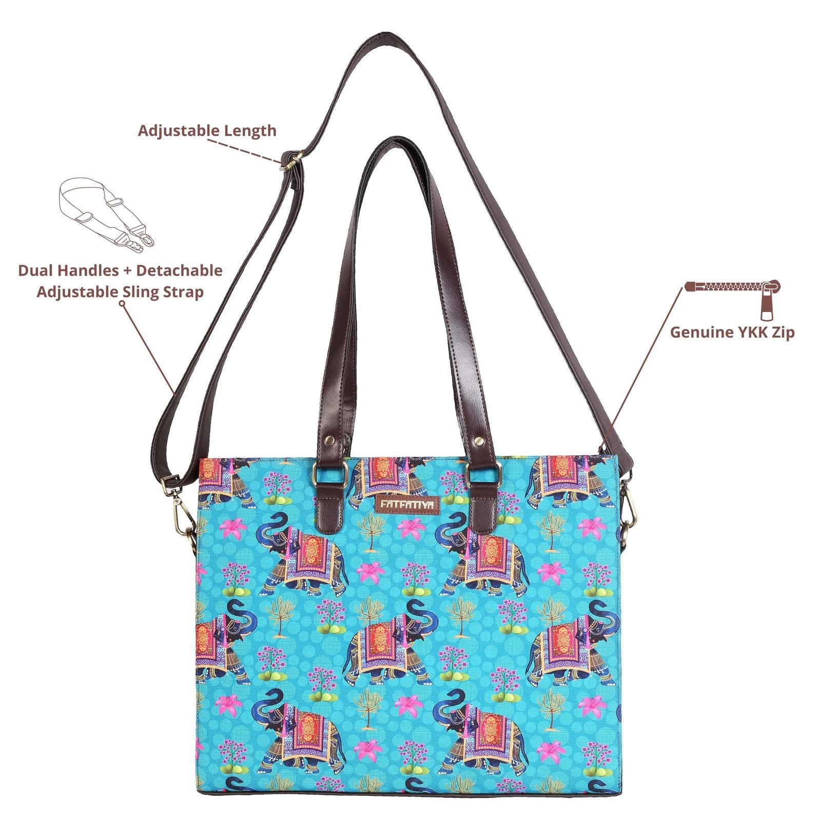 Elevate your everyday work style with the Fatfatiya Elephant Print Office Tote Bag, a perfect blend of vibrant design and practical functionality. Featuring a beautiful blue background with colorful elephant artwork, this eye-catching tote bag adds a playful yet sophisticated touch to your professional look while reflecting artistic Indian inspiration.