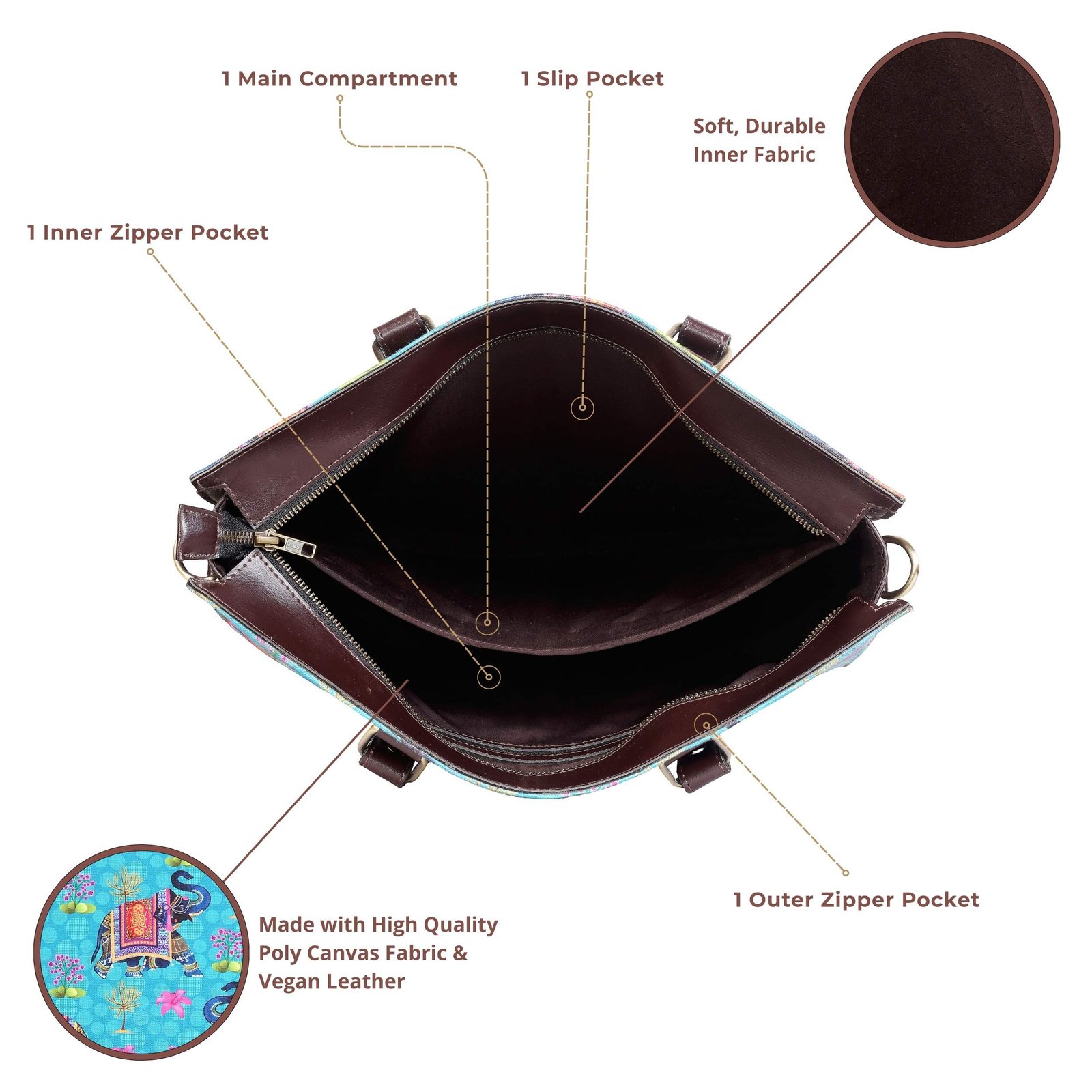 • Made with High Quality Poly Canvas Fabric & Vegan Leather