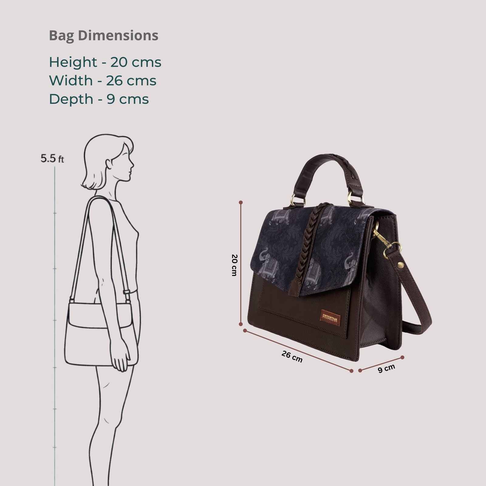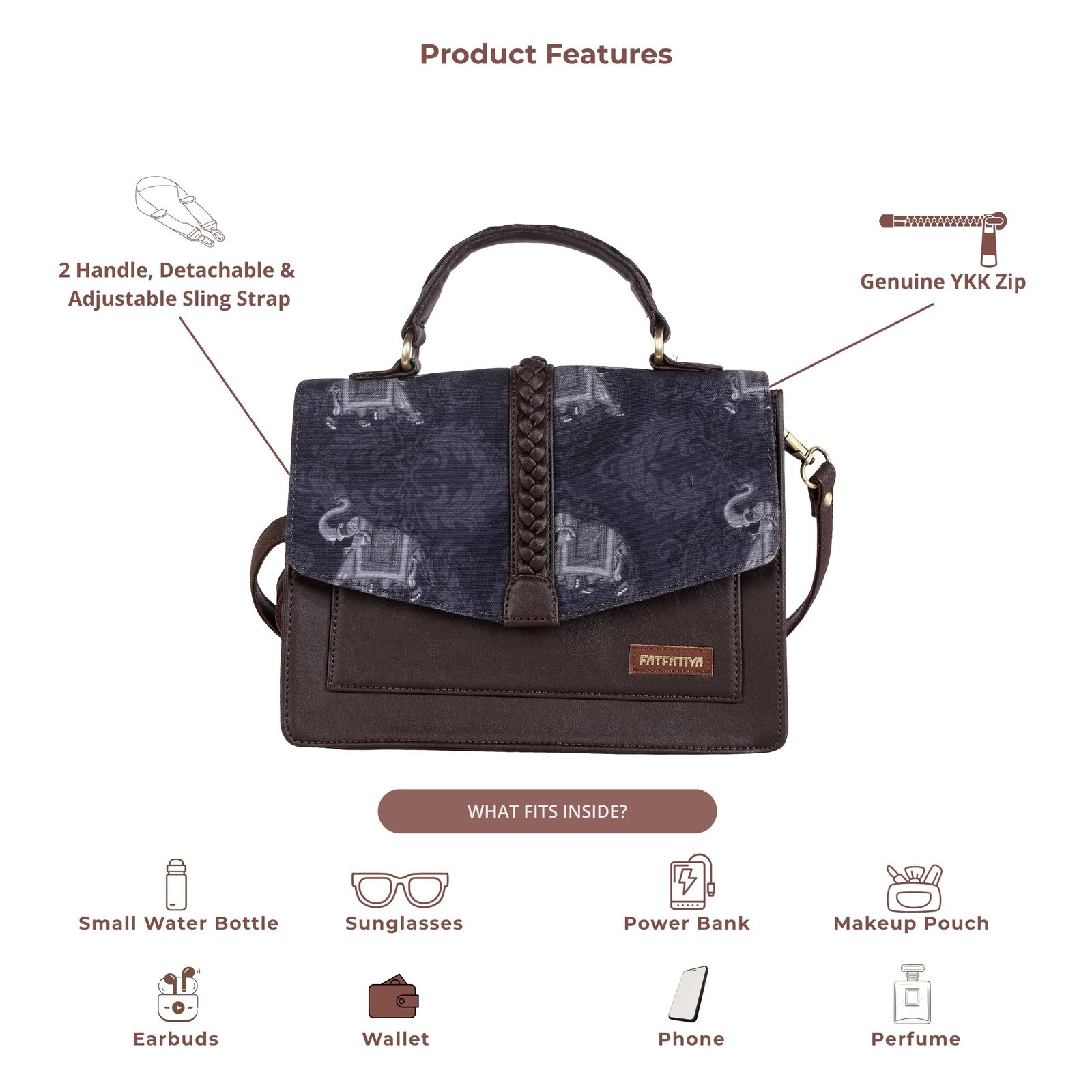 Upgrade your everyday style with the Fatfatiya Women’s Heritage Elephant Print Satchel Bag, designed in a deep navy tone with subtle royal motifs and elegant elephant artwork. This artistic satchel blends cultural charm with modern structure, making it a sophisticated statement piece for women who appreciate timeless design.
