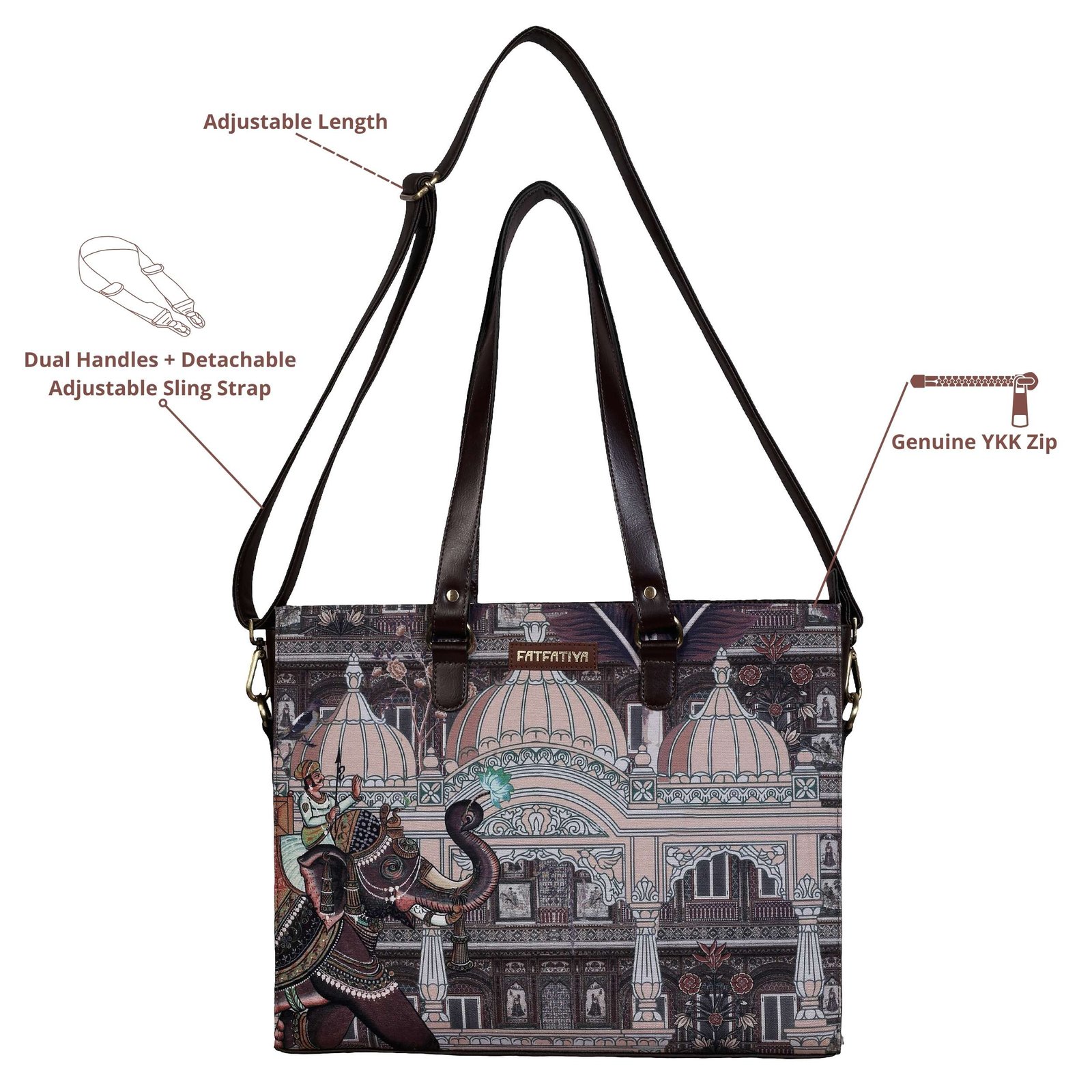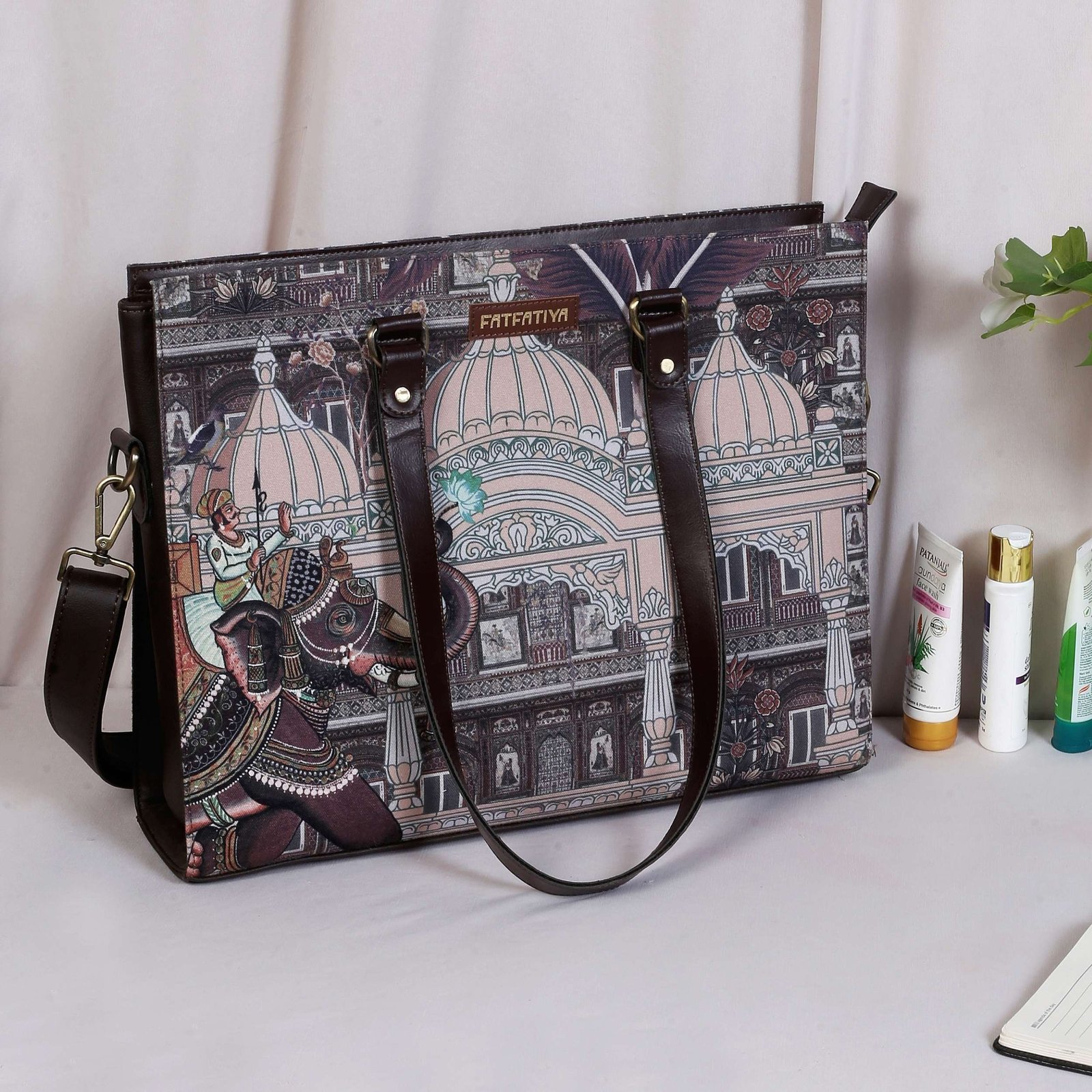 Enhance your everyday work style with the Fatfatiya Indian Palace Art Print Office Tote Bag, a perfect blend of artistic design and practical functionality. Inspired by traditional Indian heritage, the bag features a beautifully detailed palace illustration with an elephant rider artwork that adds a unique cultural charm to your professional look.