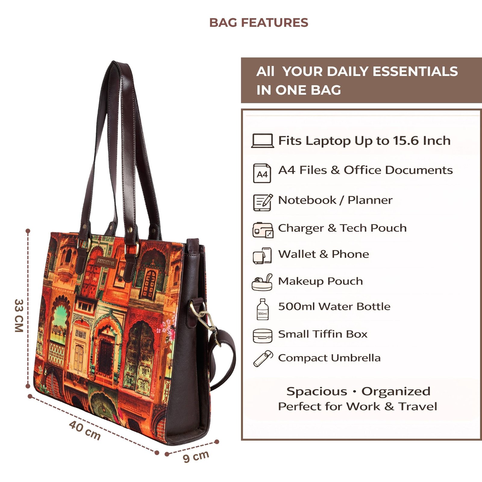 Perfect for office, college, meetings, travel and daily commuting, the Fatfatiya Haveli Art Tote Bag combines spacious storage, durability and eye-catching heritage design, making it an ideal accessory for women who appreciate culture, style and practicality.