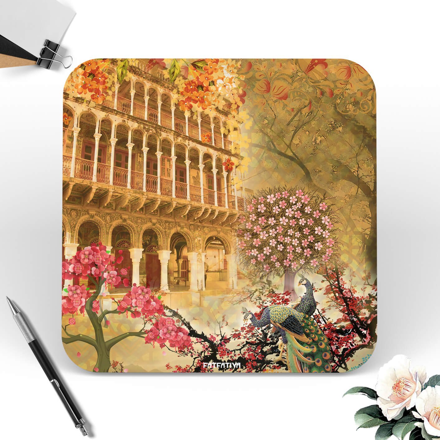 - Art-Inspired Design – Features a majestic peacock with royal arches and floral detailing in a soft, earthy palette.