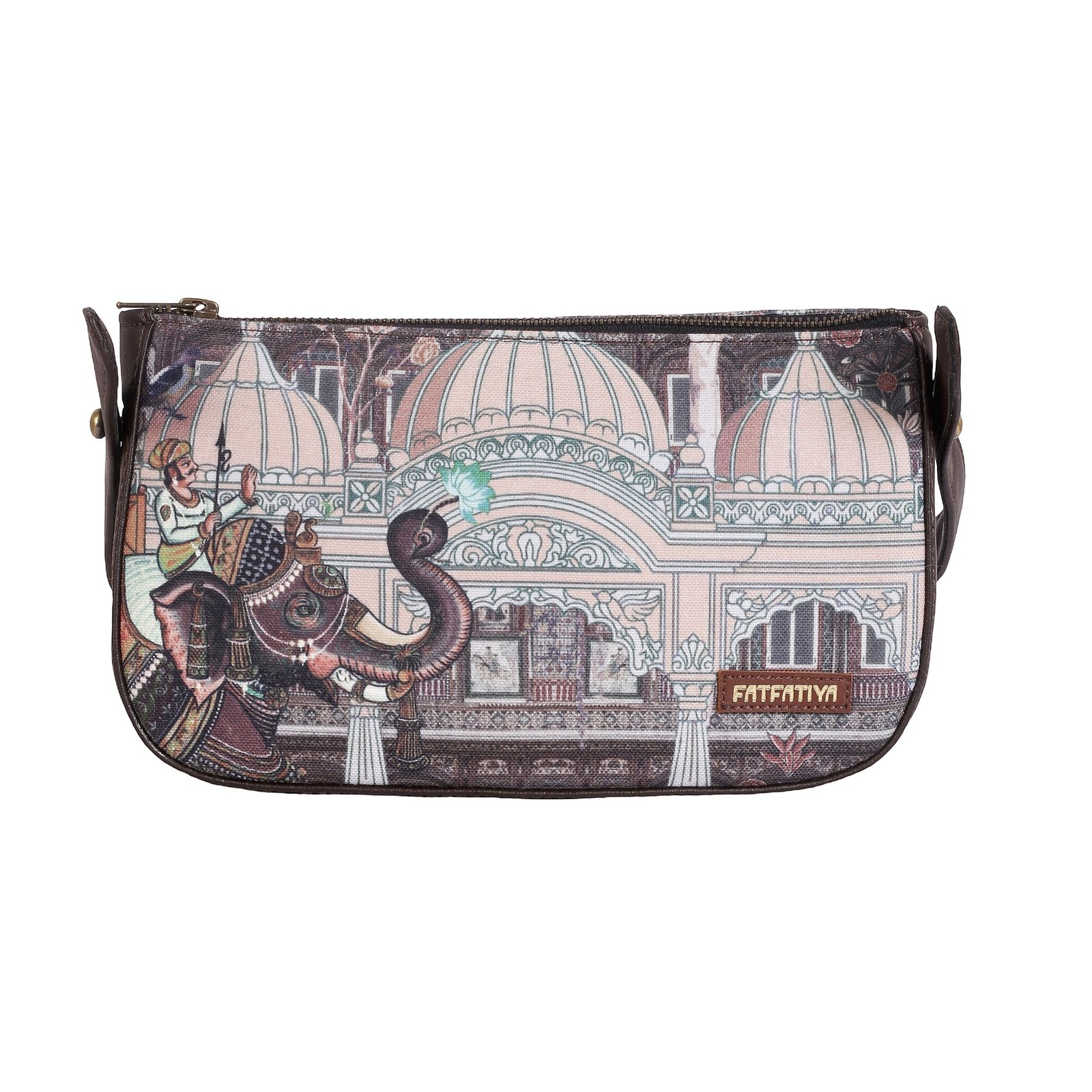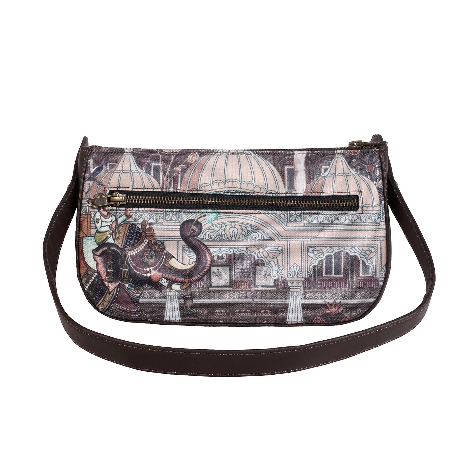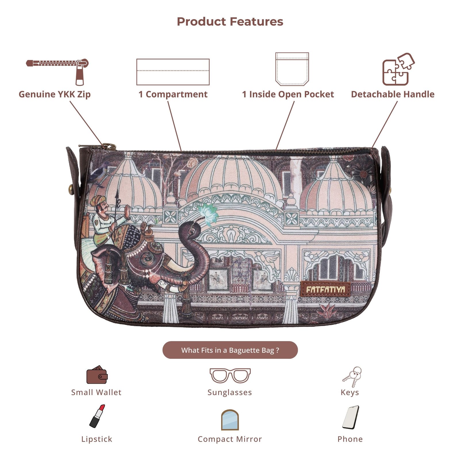 Embrace the beauty of cultural artistry with our Women’s Vintage Rajasthani Architecture Art Baguette Shoulder Bag. Adorned with a stunning elephant design that captures the essence of traditional palace-inspired motifs, this stylish handbag is meticulously handcrafted in India. Featuring a sleek curved silhouette, it is made from durable poly canvas fabric adorned with luxurious vegan leather accents. With a main zippered compartment, an external zip pocket, and an inside open pocket, keep your essentials organized while showcasing your unique style. The detachable shoulder strap offers versatile wear options, making it the perfect companion for casual outings, festive occasions, or when dressing up your ethnic and fusion outfits.